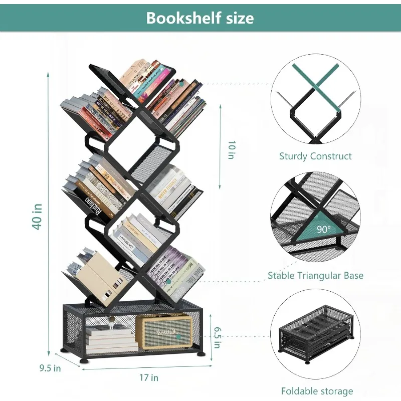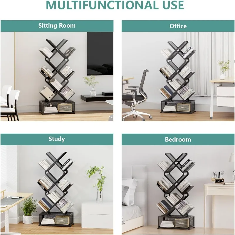 - 【Stable Structure & Durable】The bookshelf is designed to be unfolded on both sides and does not need to be equipped with an anti-tipping device or fixed to the wall.no matter where the book tree bookshelf sits, it can stand safely without worrying about tipping over.Made of high quality metal materials, this bookshelves tower ensures enhanced load-bearing capacity, offering durability and stability for your storage needs.
